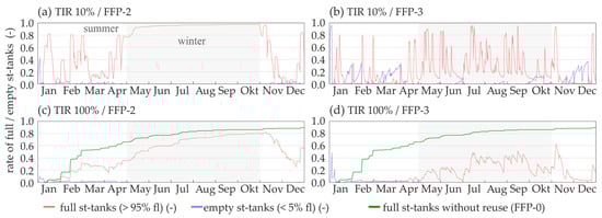 Ratio of full and empty st-tanks at each time step (DWS-st): (a) TIR 10%, FFP-2; (b) TIR 10%, FFP-3; (c) TIR 100%, FFP-2; (d) TIR 100%, FFP-3.
