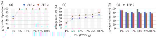 Results for the DWS-lg scenarios: (a) ffp-factor for greywater; (b) greywater storage rate (sr); and (c) sewage volume (rv) compared to FFP-0 (without greywater reuse).