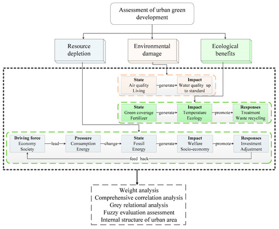 This figure shows three aspects (resource depletion, environmental damage, and ecological benefits) to consider in the assessment of the UGD. Then, the DPSIR model was used to classify and quantify different indicators, eventually allowing indices to be calculated to analyze the UGD tendency.