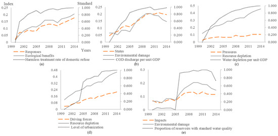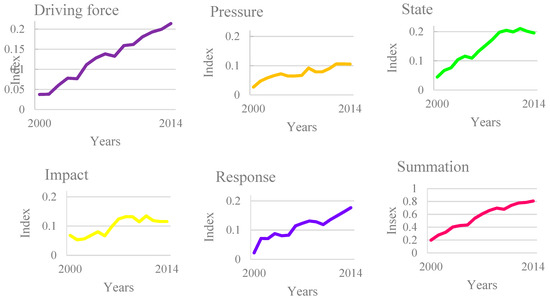 The comprehensive indicator analysis can offer the variation tendency of second-level indicators (DPSIR) and first-level indicators (three aspects) from 2000 to 2014. In order to observe the continual change of the comprehensive indicators of UGD, the data are processed accordingly. The values of the comprehensive hierarchical indicators are the sums of the values of the selected indicators, which included the weights, and the following figures (from Figure 5, Figure 6 and Figure 7) show the results of these calculations. The results of the analysis of these indices are discussed below.