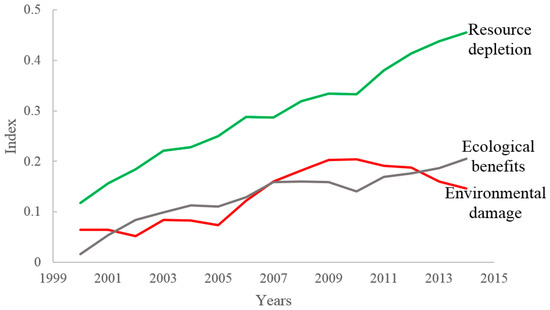 Initially, the environmental damage index declined from 0.2 to 0.14 after 2010, exhibiting a different tendency than that of the resource depletion index and the ecological benefits index. Therefore, the environment has obviously not done very well in the UGD process. However, according to Figure 5, the growth of UGD improved, and the environmental damage index decreased slightly, mainly due to the contradiction between the environment and the non-transformation of industry, but it is also possible that policies supporting environmentally friendly development have had some effects.