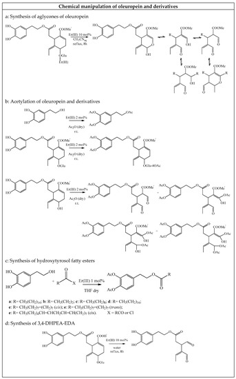 A simple acetylation protocol for obtaining the acetyl derivatives of oleuropein from the obtained aglycone and hydroxytyrosol was also developed (Figure 2b). Researchers have reported the biological evaluation and molecular modelling results of natural and semisynthetic oleuropein derivatives. All of the considered molecules have shown significant anti-inflammatory activity [53] and anti-proliferative and antioxidant effects on breast cancer cells [54], as well as antigrowth actions [55].