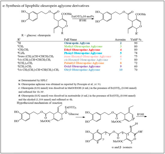 Exploiting the ability of erbium(III) to coordinate the oxygen atom, a new group of lipophilic oleuropein aglycone derivatives was synthesized through a transacetylation reaction with oleuropein and different fatty alcohols (Figure 2e) [64]. Oleuropein aglycone derivatives with long saturated and unsaturated alkyl chains were evaluated in terms of their lipophilicities and antioxidant capacities, both in chemical and biological environments, to establish whether they could be potentially used as antioxidants in a fatty matrix and if augmented lipophilicities would correspond to better cellular internalization and antioxidant activity. Both the LC-MS and 1H NMR analyses of all the obtained compounds showed the presence of two isomeric products. Indeed, the hypothesized mechanism allows for the formation of an oxonium ion, which results in the formation of two diastereoisomers. These reactions occur through the anchimeric assistance of heterocyclic oxygen. Erbium coordinates acetal oxygen, resulting in the formation of the oxonium ion and subsequent attack of the nucleophilic alcohol (Figure 2e).