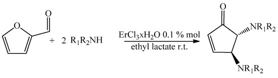 Conventionally, these compounds are synthesized from furaldehyde and primary or secondary amines, but in low yields and under harsh reaction conditions [66]. Procopio and co-workers demonstrated that the employment of only 0.1 mol % of ErCl3 × 6H2O in ethyl lactate was enough to obtain a quantitative yield of diaminocyclopentenones in 30 min. The products were formed exclusively as transdiastereomers, consistent with thermal conrotatory π4a electrocyclization, reminiscent of Nazarov cyclization [67].