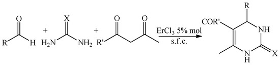 The catalysis of this very mild and environmentally benign Lewis acid was further used in the well-known Biginelli reaction to produce 4-aryl-3,4-dihydropyrimidin-2(1H)-ones (DHPMs) in a simple one-pot condensation between ethyl acetoacetate, benzaldehyde, and urea [68]. Procopio and his co-workers [69] synthesized a library of dihydropyrimidinone derivatives, performing the Biginelli reaction under pressure, in solvent-free conditions and using 5% mol of Er(III)chloride (Figure 4) in a microwave or Q-tube reactor.