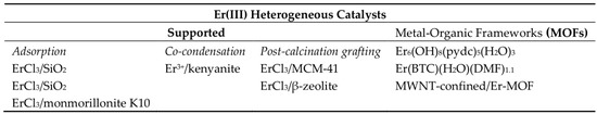 Concerning the possibility of supporting a homogeneous catalyst into a solid matrix, three different methods have been proposed for Er(III) catalysts: Er(III) adsorption over the solid support [75,76], Er(III) co-condensation into the inorganic framework [77] and post-calcination Er(III) grafting on the solid surface [78,79,80,81,82].