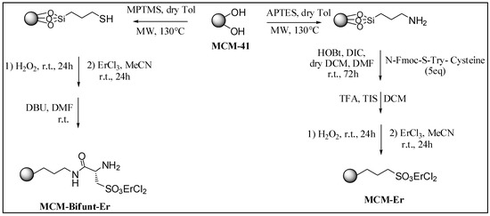 Synthetic schemes of MCM–Er catalyst and MCM-bifunctional Er catalysts, according to Procopio et al. [79,80,81,82].