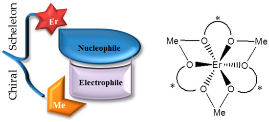 Although the lanthanide group elements are considered with homogenous characteristics in mind, differences in the ionic radius allow relevant differences both in reactivity and in entantioselectivity to be obtained, as reported by Shibasaki at al. [108]. In the nitroaldol reaction used as a reaction test, the same BINOL ligand and alkali metal were combined with different rare earth elements. It was observed that a small change in the Ln(III) radius generally resulted in increased catalytic activity and often in increased enantioselectivity. In this way, when the right pair is combined, it is possible to obtain good results for different enantioselective transformations, or, in some cases, to obtain a selected enantiomer, simply by changing the rare earth element in the catalyst. Regarding Er(III) based catalysts, only one, comprising a small amide-based ligand derived from an α-amino acid, was developed, to obtain a syn-selective catalytic Mannich type reaction that was tunable into an anti-selective one by changing the Er(III) salt with a Sc(III) salt [109]. The amide-based ligands’ characteristics, such as the rigidity of the planar amide and conformational flexibility of the α-carbon, combined with the multiple coordination modes and coordination numbers of the rare earth element, provided flexible structural dynamics.