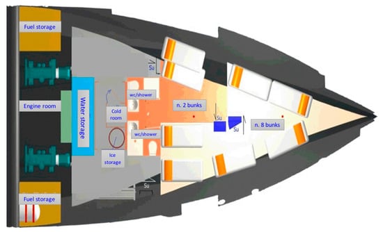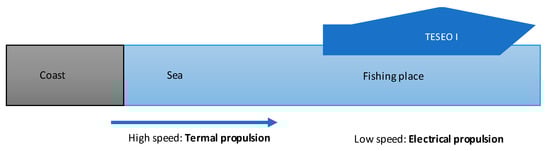 In line with Figure 3, one of the three projects related to the first objective of the TESEO Project involved the production of a prototype vessel for fishing: the TESEO I. The specific aim was the realization of a prototype of high efficiency and low environmental impact that, at the same time, was able to meet the needs of comfort and safety of fishermen during the various phases concerning their activities on board. Indeed, over the period of the development of the prototype, not only were issues identifying innovative solutions consistent with low environmental impact considered, but quality, reliable, sustainable, and resilient infrastructure to support well-being on board was also promoted and realized.