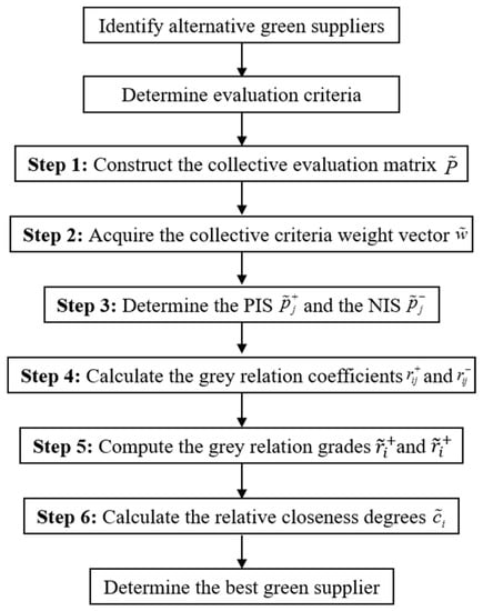 In this section, we put forward a novel integrated approach based on IVIULSs and GRA-TOPSIS method to evaluate and select the optimal green supplier. In the proposed green supplier selection model, IVIULSs are used to assess the green performance of suppliers under economic and environmental criteria, and the GRA-TOPSIS method is utilized for ranking the alternative green suppliers. The flowchart of the proposed approach for the selection of green suppliers is shown in Figure 1.