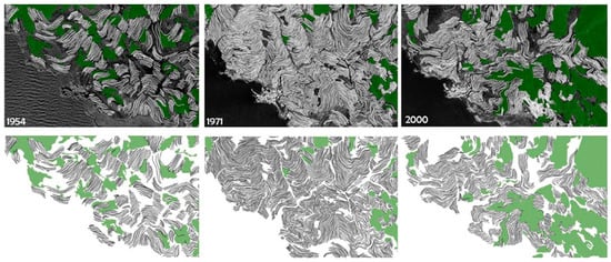 The 1954 flight renders a territory widely used for agriculture with the technique of terracing. However, natural areas with forest vegetation can be seen. With the 1971 flight, a strong expansion in terracing can be seen, which extends throughout the territory, eliminating nearly all the natural areas. Starting in 2000, a decided decrease in cultivated areas can be seen, with the consequent abandonment of terraces and their degradation, along with the growth of uncultivated green areas. The orthophoto of 2015 shows the current situation: numerous abandoned terraces, with evident degradation and current or potential instability phenomena (Figure 4 and Figure 5). Vegetation has overtaken these areas in secondary succession, leaving the olive trees abandoned, mixed with the Mediterranean macchia. A subsequent part of the study on the territorial signs was dedicated to identifying some types of terracing among the most evident or repeated.