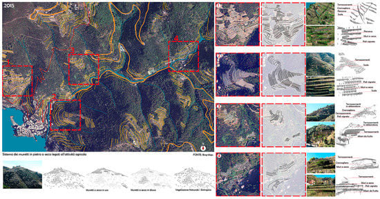 Methodological investigations implemented for the system of terracing and the differences that emerged between the historical and new terraces with respect to the different construction techniques, agricultural production and management of the piece itself, move precisely in this direction. In this case, the detailed methodological approach is necessary to understand the phenomena of territorial stability, the productive/agricultural aspects and aspects that are merely aesthetic/perceptual that the image of the individual terrace gives to the overall patchwork. The result is the framework of a landscape in which it is possible to trace rules of internal “particle” composition and the “aggregate” composition of the more general system—the distinctive character of this UNESCO heritage—as well as the aspects to guarantee and transmit to future generations.