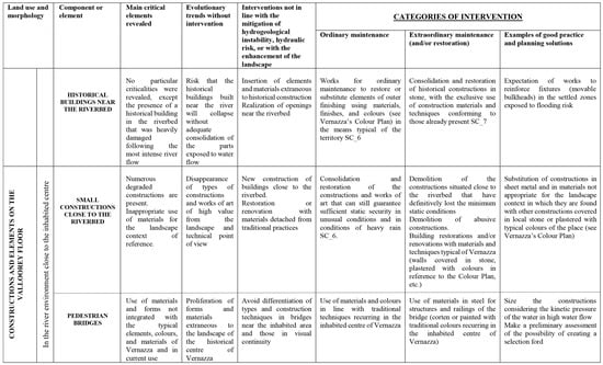 In this sense, restoration and conservation grow in importance, not only in a landscape key but also in a functional key, of the historical/traditional works for systematization. It is telling that the “state of conservation” section in the proposal for registration as a UNESCO Heritage site for Portovenere, Cinque Terre and the islands (Palmaria, Tino and Tiretto) states that it is “[…] unthinkable to abandon terracing to itself, since the terraces are the expression of experienced architecture with a monumental character, an exclusive sign of the material culture of the people that produced it.” Various experiences evidence how managing the flooding risk means going from undifferentiated defence of floodable spaces to a territorial project based on recognizing different existing relationships between floods and the territorial context and on the definition of new landscape structures [8]. This step is also inspired by the same EU Floods Directive that encourages national governments to adopt prevention measures based above all on reducing the vulnerability of anthropic structures [9]. In an attempt to develop this aspect, the urban-planning discipline and the discipline of design assume the responsibility of contributing to preventing damage and increasing the resilience of the landscape—meant as the capacity to absorb the modifications made by calamitous events [10]. At the same time, the need for a pragmatic attitude emphasizes active policies rather than the reactive policies that emerge after a catastrophic event. This constitutes a good warning for interventions established by the “Italia Sicura” National Plan. The interventions cannot be limited to mitigating each work for defence or to prevent hydrogeological risk but it is necessary to design the defensive work so it can become a generator of the landscape. Therefore, policies to reduce impacts are not enough. Actions aimed at the overall renovation of the landscape are required, intended as resulting from the multiple processes that occur between components and processes, both environmental and anthropic. This approach requires a vision of the whole, integrated with the project, which foresees: (a) in a preliminary and priority way, the analysis of the landscape system, the characteristics and criticalities that characterize it on different scales It is from this fundamental exploratory activity that the means of intervention useful to improving the background conditions on the level of the system can be triggered, profiting from the new infrastructure defensive works; (b) activation of a project-construction process, which, in light of the environmental and landscape objectives defined in the preliminary phase, can determine the necessary interventions for mitigation and compensation. The process is composed of an organic system of: criteria, guidelines, good practices for mitigation and compensatory interventions and maintenance and management practices that pursue the landscape, ecological, environmental and socio-economic efficiency of the planned interventions.