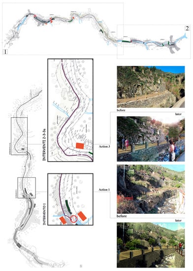 The masterplan spatially specifies the guidelines and also systematizes and makes coherent specific actions and categories of intervention. It represents a single technical/operational design that conceptually and graphically renders the works to be realized. Coherent with the type of area identified in the critical/evaluation phase, the masterplan identifies the technical interventions to be made, in harmony with the appearance and historical/cultural values of the entire territory. Each individual intervention resolves a problem technically and contributes to recovering and enhancing the wider landscape. This links to the system of terracing, pedestrian crossings, the mitigation and environmental/landscape character of the natural engineering works realized. It leads to a role of design synthesis between the large and small scales of cultural values of the UNESCO heritage under consideration and of the entire methodological and cultural approach of the research (Figure 7).