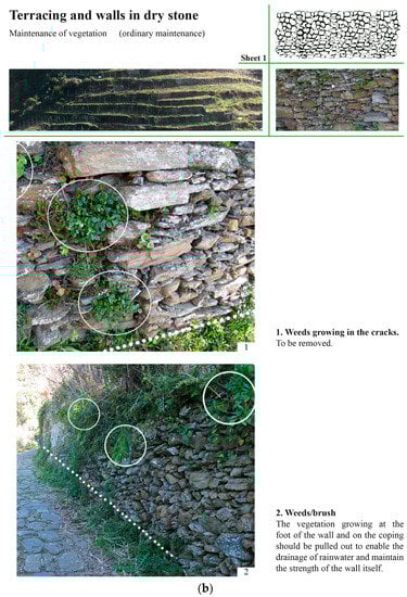 These sheets identify the different types of intervention possible as a function of the instability to be counteracted. They also describe the main details of the project, indicating the materials used and the finishing works, always following the general strategy of protection, conservation and enhancement of the cultural and landscape heritage of the territory. In this sense, the types of intervention possible as a function of the instability to be counteracted do not foresee excavations or other modifications of the local morphology. In harmony with what emerged in the analytical/exploratory and critical/assessment phase, the specification sheets were drafted for the following types and elements of the anthropic/landscape system: terraces and walls in dry stone, traditional agriculture, historical constructions/buildings, railings, levees and riverbanks, weirs and crests. By way of example and methodology, the following lists the planning actions suggested for the type of terrace and dry stone wall (Figure 8a,b).