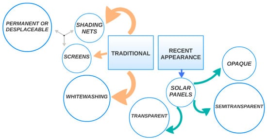 To correct high and low temperatures, several shading systems in greenhouses are available: bleaching, mesh, screens, and photovoltaic panels (Figure 1).