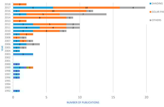 The use of alternative energy in agricultural production is desired by many researchers, especially for protected crops that are grown in greenhouses with photovoltaic panels on the roofs. These panels allow for the passage of varying levels of sunlight according to the needs of each type of crop. In this way, sustainable and more economic energy can be generated than that offered by fossil fuels. The objective of this work is to review the literature regarding the applications of selective shading systems with crops, highlighting the use of photovoltaic panels. In this work, shading systems have been classified as bleaching, mesh, screens, and photovoltaic modules. The search was conducted using Web of Science Core Collection and Scopus until February 2018. In total, 113 articles from scientific journals and related conferences were selected. The most important authors of this topic are “Yano A” and “Abdel-Ghany AM”, and regarding the number of documents cited, the most important journal is Biosystems Engineering. The year 2017 had the most publications, with a total of 20, followed by 2015 with 14. The use of shading systems, especially of photovoltaic panels, requires more crop-specific research to determine the optimum percentage of panels that does not reduce agricultural production.