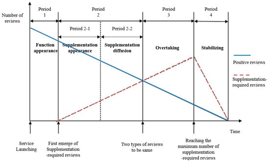 The graph in Figure 2 can be classified into four different areas. The first area is the area from the time when the service first launched, to the time when a supplementation-required review first emerged. The second area is the area from the time when a supplementation-required review first emerges, to the time when the number of positive reviews and the number of supplementation-required reviews were the same. Note that the second area can be divided again into two sub-sections but can also be treated as a homogeneous area according to the analyst. The third area is the area from the time when the number of positive reviews and the number of supplementation-required reviews are the same, to the time when the number of supplementation-required reviews reaches its maximum. Finally, the fourth area is the area in which both the numbers of both types of reviews are decreasing. Note that the second area can be divided into two or more areas according to the length of each area. The ratio to divide the second area can differ according to the firms’ intention.