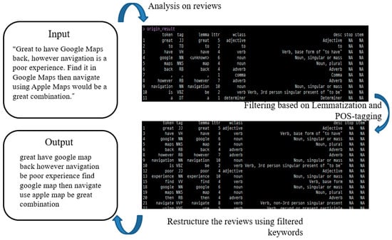 To preprocess the text data, we employed the KoRpus package in R. Lemmatization and POS (part of speech)-tagging were conducted for each customer review using TreeTagger, which is a language-independent POS tagger developed by the Institute for Computational Linguistics of the University of Stuttgart [43]. We made vector verbs, nouns, adjectives, and adverbs, which were extracted and then processed for lemmatization, as shown in Figure 3. Unigram language model was used for this purpose.