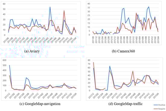 Regarding the research framework suggested in Figure 2, it is assumed that all customers are satisfied with the new function; thus, this new function is considered to be purely attractive. However, this is hard to apply in practice, since many competitors and reference application services exist in the market. In addition, customer feedback is particularly plentiful and updates are significantly fast. Therefore, our assumption may not be valid in practice. As shown in Figure 4, many supplementation-required reviews exist at the very beginning of the launch.