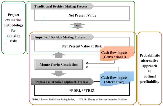 In particular, investors dealing with projects for sustainable development should be careful when making investment decisions. Investors have traditionally used the discounted cash flow (DCF) method to make decisions when investing in projects and it is widely used because it is simple to use and understand. The value of the DCF method is based on the cash flow of the investment project. In this paper, the factors affecting cash flow are defined as profitability impact factors. The disadvantage of the DCF method is that it does not reflect risk, and so, it has difficulties in recognizing, preventing, and overcoming the risks of the project. A way to reflect these risks is the Value-at-Risk (VaR) method which can be applied as an improved project-profitability indicator to estimate the future uncertainty risks. The VaR method, introduced in the late 1980s by major financial institutions, is one of the risk-measurement methods that can be used to quantitatively predict the amount of loss due to risk. While the input factors used in the DCF method have fixed values, the input factors used in the VaR method have variable values depending on the risks. Although the VaR method has the advantage of reflecting the risk, its disadvantage is that the decision criterion is conservative due to excessive recognition of the risk, which often leads to loss of an investment opportunity for investors. In previous studies, the VaR method for various projects has been applied to evaluate the risk by reflecting the project [8,9,10,11]. For sustainable development, investors need to select good investment opportunities that are less risky and more profitable for their projects. Therefore, this paper proposes a method to support investors’ through a probabilistic alternative approach that takes advantage of the VaR method. VaR has been used in previous studies to analyze risk factors through sensitivity analysis to select risk priorities [12,13,14]. This paper proposes a probabilistic approach to compare and analyze alternatives using the Theory of Inventive Problem Solving (TRIZ or TIPS) and the business version of the Project Definition Rating Index (PDRI) as a differentiating method from previous studies. Unlike previous studies, this method is not limited to presenting only alternatives, it also presents new input factors that reflect the risks and helps determine whether various alternatives are actually applicable for sustainable project development.