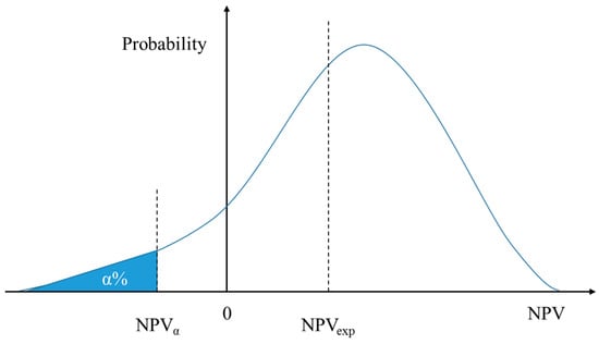 In this paper, VaR refers to the NPV for the maximum loss that may occur during a relatively long operation period of a project, whereas the general VaR, which is used in financial sectors, refers to the amount of loss for a relatively short period of time. The NPVaR method is applied to the VaR in terms of the NPV as it applies a discount rate on the cash flow of the project during the project period. As shown in Figure 3, NPVα is defined as the NPV corresponding to the significance level of α; that is, it refers to the minimum NPV at the (1 − α) confidence level [8].