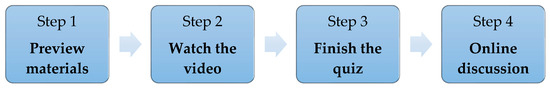As shown in Figure 1, through a series of teaching design, students can complete the systematic study of theoretical knowledge on the platform. In the first step, students complete a preview of the content of the teaching materials at the time specified. The second step is to assist the reading and preview of the textbook. Students can repeatedly watch the specified open online video, which usually contains 2–4 small fragments, each lasting about 7 min. The third step is to complete the test questions at the end of each lecture, including single topic selection, multiple choice questions and judgment questions, where they need to maintain a score of more than 80% to enter the next lecture. Step 4, students can create discussions from the first 1–3 steps in the online designated discussion area. On the same platform they will be entitled to posting questions, answering questions and sharing learning experiences.