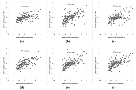 Figure 5c–f show the results of the leakage ratio using 6-6, 6-12, 12-6, and 12-12 neurons in multi-hidden layers of the ANN model. In the multi-hidden layers, the determination coefficient was the highest at 0.55 when 12 neurons were used in the first and second hidden layers. The conclusion was that the condition using multi-hidden layers predicted the leakage ratio more accurately than that using a single hidden layer.
