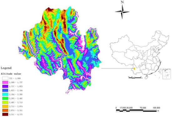 In order to understand the impact of mountain urbanization on resources and environment, Dali Prefecture of Yunnan Province was selected for observation. Established in 1956, the Prefecture is the only Bai Autonomous Prefecture in China, located in the central west of Yunnan Province, 398 km away from the provincial capital of Kunming (Figure 1). The Prefecture is located at the junction of Yunnan-Guizhou Plateau and the Hengduan Mountains, with an average elevation of 1974 m. It is under a subtropical low latitude plateau monsoon climate, with the average annual rainfall of about 1000 mm and the average annual sunshine time of 2345 h [36]. Due to the complex topography and vast elevation difference, the vertical difference of climate is significant. Dali Prefecture has a land area of 29,459 km2 with mountain areas accounting for 93.4%. The land area of steep slopes with the inclination above 25 degrees and the gentle slopes with the inclination of 8–25 degrees occupies 41% and 51% of the total area respectively. The plain sub-region area with the inclination between 0 and 8 degrees occupies only 6.6% of the total area [37]. According to the statistics of the Dali State Planning Bureau, the plain sub-region area has 57.8% of the settlements and is the land carrying area with relatively concentrated population, relatively active economy, and urban development.