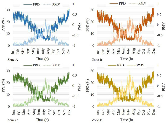 Predicted percentage dissatisfied (PPD) and predicted mean vote (PMV) for zone A (blue), zone B (orange), zone C (green) and zone D (yellow) in the renovated building.
