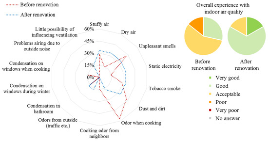 Overall experience with indoor environment and problems related to the indoor environment from respondents living in the building before and after the renovation.