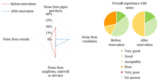 The overall perception of noise in the apartment also improved after the renovation, see Figure 6. Some of the residents experience problems with noise from ventilation, which is common for supply and exhaust ventilation systems, where inlets are placed in the bedrooms.
