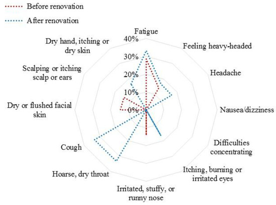 Symptoms of fatigue are noted by a couple of respondents in the building before the renovation, see Figure 7. Together with heavy-headedness and headaches, fatigue could be a symptom of poor ventilation [32]. Environmental factors such as dry air and stuffy air are often prevalent at the same time, which is not indicated by the respondents, see Figure 5. Bad odors can also be an indicator of problems with air pollutants or moisture, but is then most often combined with symptoms related to nose, throat and eyes [32]. Symptoms that occupants experienced before the renovation have been reduced, but one resident experienced problem related to dry skin, itching and irritated nose after the renovation, which was not indicated in the questionnaire handed out before the renovation.