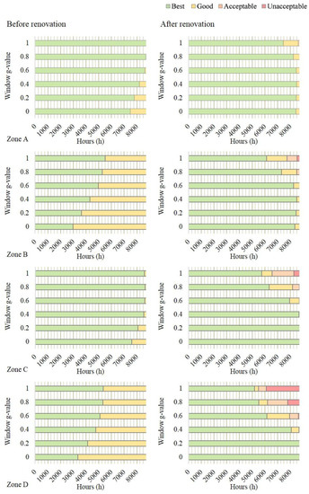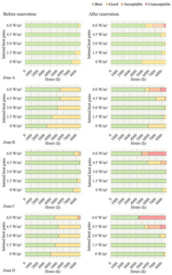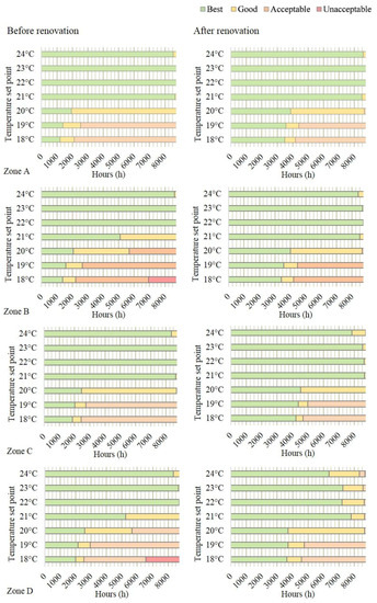 A low indoor temperature is desirable from an energy perspective but causes problems with poor thermal comfort. However, in buildings with a high degree of thermal insulation and heated supply air, the thermal comfort is perceived as better at lower set points for the indoor temperature. As seen in Figure 8, thermal comfort is “best” or “good” for nearly the whole year in the renovated building with a set point of 20 °C, whereas it falls into the “acceptable” category for large parts of the year in zones B and D in the pre-renovation case. The measured indoor temperature in the unrenovated building and the poor overall experience with the indoor thermal environment indicated in the questionnaire are consistent with these results.