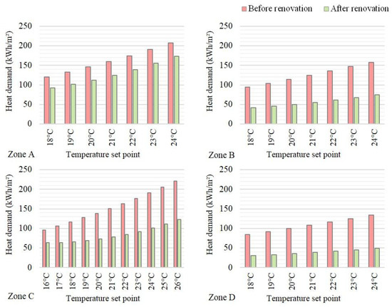 Increasing the set point by 1 °C increases annual energy use for the whole building by on average of 8.9% for the building both before and after renovation. Simulated energy use per heated floor area for different zones is seen in Figure 9. The most significant difference between the cases before and after renovation is seen in zone D, the largest apartment on the top floor. In the large reference zones (zone B and D) and an indoor temperature set point of 22 °C would be needed to achieve similar thermal comfort in the unrenovated building as in the renovated building, which would require an additional 24.7 MWh per year and increase the total energy use by 24.9% compared to the actual heat demand before the renovation.