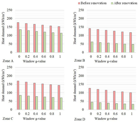 Solar heat gains have a greater impact on heat demand in the renovated case. The difference between no solar heat gain (g-value = 0) and full solar heat gain (g-value = 1) is 21.7% for the renovated building and 15.9% in the pre-renovation case, see Figure 11.