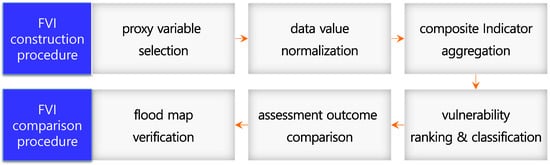 The analysis procedure diagram for the (flood vulnerability indicator) construction and comparison.
