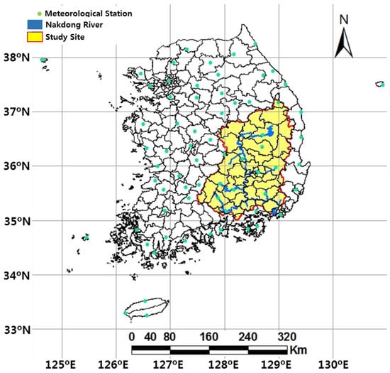 The localization of 54 administrative districts (yellow) under study along with 75 gauge stations (green) managed by the Korea Meteorological Administration and the main streamlines (blue) in the Nakdong River Watershed (red).