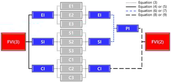 Note that all the component indicators , , and aggregated from proxy variables need to be normalized with the same maximum value of 1 to affect a composite indicator equally, which can prevent any unintended weighting effects for further comparison of assessment components in the aggregation process by Equations (4), (5), (8), or (9). The computational framework for the is presented in Figure 3.