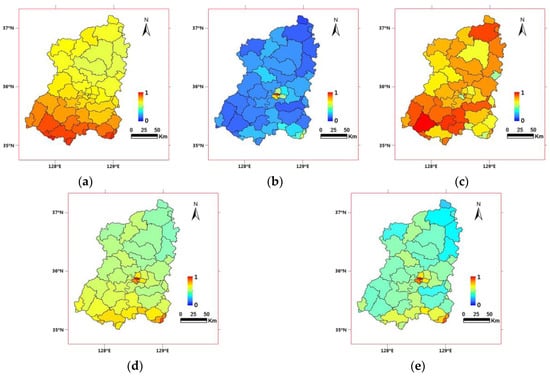 Figure 4 shows the spatial distribution of three constituent component indicators, and , along with the two kinds of potential impact indicators, and . The value of the exposure indicator is higher in the south part close to the coastline where typhoons and the summer monsoon effects are more dominant. The value of the sensitive indicator is higher in the middle and the right bottom parts where the large cities with higher population densities and urbanization rates are located. The value of the coping (lack of coping) indicator is higher in the southwestern part of the study site under relatively poor conditions of structural and nonstructural countermeasures for flood disasters. Such a greater vulnerable condition in the coping component can lead to higher flood vulnerability outcomes despite relatively lower sensitivity conditions, particularity for additive composite indicators, as a result of higher compensability in aggregation schemes. In the potential impact indicators and combined from the two component indicators and , the sensitivity indicator with large variations is more influential one generating higher values for the large metropolitan cities. A peculiar feature in the component indicator outcomes is that the values of exposure and coping indicators and are highly distributed over this study site with accordingly higher minimum values.