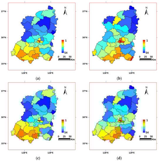 Figure 5 shows the spatial distribution of the flood vulnerability ranks based on the four different composite indicator outcomes and from the three components, and and from the two components by additive and multiplicative utility functions. Regardless of the construction frameworks for the flood vulnerability indicator, higher flood vulnerability to climate change is evaluated for most of districts in the three metropolitan cities, Busan, Ulsan (right lower), and Daegu (around center) that have relatively higher values of , and for the administrative districts in the southwestern part of the study site that have relatively higher values of and . Meanwhile, lower flood vulnerability to climate change is shown in the mid-northern administrative districts that have relatively lower or moderate values of all the three components. It is also found that the volatility of rankings and rank reversals occur in the four flood vulnerability results for some administrative districts. A greater interpretation on the differences in flood vulnerability results is presented in the following sections.