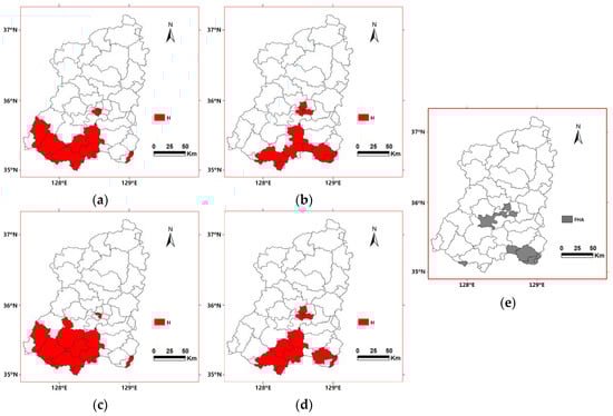 Spatial distribution of the 18 administrative districts with high vulnerability level (H) based on the four composite indicators for the study site: (a) districts rated H from ; (b) districts rated H from ; (c) districts rated H from ; and (d) districts rated H from along with (e) the 10 administrative districts including flood hazard areas (FHA) rated Class 1 by the MOIS in 2010.