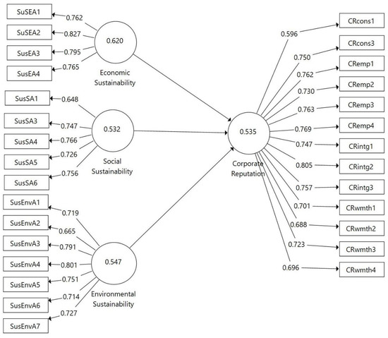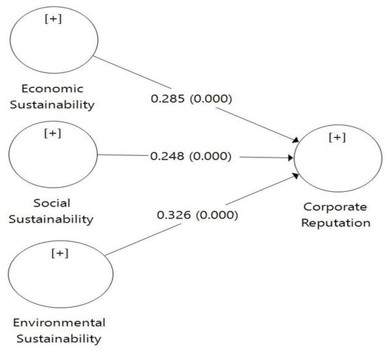 Furthermore, it has been determined that almost 50.8% of variance in corporate reputation (R2 = 0.508) is explained by economic, social and environmental sustainability. The effect size (F2) of the coefficient of determination (R2) is critical because it determines the strength of the variance explained by these individual constructs. An effect size of 0.02 is considered small, 0.15 to be medium and 0.35 to be large [74]. The effect of social sustainability (F2 = 0.066) is small, whereas the effect of economic sustainability (F2 = 0.102) and environmental sustainability (F2 = 0.144) is medium on the proposed model. The summary of the structural model is presented in Table 3.