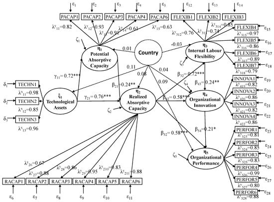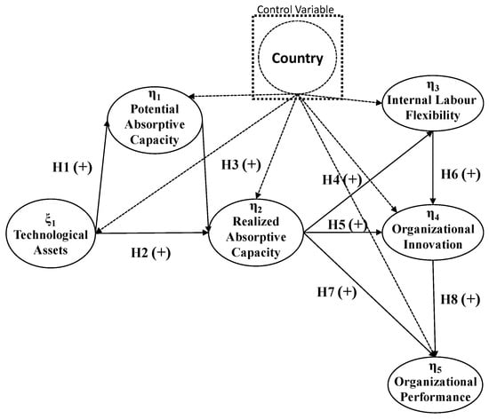 Figure 1 presents the proposed theoretical model with one exogenous latent variable [technological asset (ξ1)], and several endogenous latent variables [potential absorptive capacity (η1) as first-degree and realized absorptive capacity (η2), internal labour flexibility (η3), organizational innovation (η4) and organizational performance (η5) as second-degree]. Country is used as a control variable. The theoretical model was analysed with the Lisrel 8.70 programme.