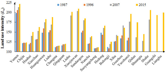 During the past decades, developed countries have experienced unprecedented industrialization and urbanization. Populations in these countries increase rapidly, and urban land area continues to expand. In order to meet the growing needs of humans for products and services, ways of land investment become more diversified, leading to increased spatial difference in land-use intensity [15,16,17]. An agreement on the importance of land-use intensity and its changes has been reached. From the perspective of interaction between humans and natural environment, some researchers selected land cover, social economy, and ecological environment as indexes, and built an index system for land-use intensity [18,19,20], on which basis they studied the land-use intensity and its spatial variation on different scales [21,22,23], regions [15,24], and objects [25,26,27]. Since 2000, China has experienced rapid industrial and urban transformation, and its economic development has been greatly promoted. However, problems also occur: the shortage of cultivated land, along with the expansion of urban land area, as well as unbalanced regional development and food safety issues caused by unreasonable utilization of lands [28,29,30]. At the same time, under limited land resources, population and consumption of food have been continuously increased, and led to an increase in demands for products and services. Thus, many methods have been proposed to improve the output of limited land resources and its efficiency. For example, by increasing investment in production factors, such as fertilizer, farm chemicals, and labor force, and increasing the density and volume of buildings, the utilization of land resources can be intensified and exhibit certain spatial variation. In fact, reasonably improving current land-use intensity is the main way to guarantee balanced regional development and national food safety [6]. Research on land-use intensity mainly focuses on grading evaluation, as well as intensive use of cultivated lands, construction lands, and other lands where human activities are concentrated [31,32,33]. However, most research only explores comprehensive, large-scale land use from a single perspective. Although they can reflect land-use intensity on a macro scale, there is a lack of analysis of internal spatial heterogeneity and the use intensity of single type of land. Moreover, quantitative descriptions of land use intensity and its spatial pattern in most regions still lack a clear understanding [11,34,35,36]. Thus, developing an evaluation system for regional land-use intensity and analyzing its spatio-temporal variation, as well as the use intensity of different types of land, are very necessary.