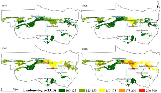 In order to study the spatial distribution of LUD on town scale, the study region was divided into three irrigation areas: Huahai irrigation district, Changma irrigation district, and Shuangta irrigation district. On this basis, the difference in LUD among three irrigation areas can be observed (Figure 4). In 1987, the development of land was slow. Except Yumen Town, with relatively high land-use degree, other towns had low or relatively low land-use degree. Among the three irrigation areas, Changma irrigation district in the middle of the study region had relatively high land-use degree, whereas the other two irrigation areas had relatively low levels of land development. In 1996, Huahai and Shuangta irrigation districts experienced obvious changes in LUD. Yumen Town in Changma irrigation district experienced a transition from relatively high land-use degree to high land-use degree. Sandaogou Town, Liuhe Town, and Huangzhawan Town experienced a transition from relatively low land-use degree to medium land-use degree. For the study region, there was a distribution pattern of “low land-use degree in east and west regions, and high land-use degree in the middle region”. From 1996 to 2007, the LUD increased significantly and the spatial distribution of LUD changed the most evidently than in other periods. In 2007, the LUD of Changma irrigation district was the highest, with concentrated regions of medium or high land-use degree. Huahai irrigation district experienced a transition from low land-use degree to relatively low land-use degree, and the LUD of some towns even reached relatively high or high levels. In Shuangta irrigation district, all the towns except Suoyang Town, had low or medium land-use degree. From 2007 to 2015, the LUD of the study region further increased. Changma irrigation district and the region of Huahai irrigation district at the north of Chijin reservoir experienced significant changes in LUD. The LUD of 95% of the towns reached medium or high levels, showing a spatial distribution pattern of “high land-use degree in east and middle regions and low land-use degree in west region”.
