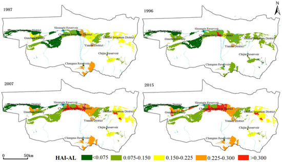- The HAL-AL in the study region decreased from 1987 to 1996, and then increased from 1996 to 2015. In 1987, 73.33% of the towns showed medium or relatively low HAL-AL. In 1996, this percentage increased to 87.5%. From 1996 to 2007, HAL-AL in all towns increased. Towns with relatively high or high HAL-AL accounted for 61.9%. From 2007 to 2015, HAL-AL still increased but only a little. In 2015, towns with relatively high or high HAL-AL accounted for 65.22%. A spatial distribution pattern of “high HAL-AL in east and middle regions and low HAL-AL in west region” was formed.