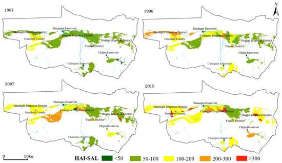 Spatial distribution of HAL-SAL in the middle and lower reaches of the Shule River Basin (1987–2015).