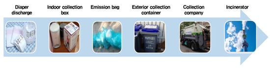Diapers were put inside the pre-distributed collection bags at the daycare centers and taken to their designated disposal locations at the assigned times; they were gathered up every other day by the collection companies [4]. Indoor collection boxes (16 L), waste bags (20 L) and stickers were provided to each of the participants. The sticker was designed to be visually attractive to promote the collection trial. The collection and transportation were done three times a week—six people were split into two regions and three vehicles were needed each day. In Korea, the municipal waste was usually separated two to three times a week. When we surveyed Korean mothers in advance, the favorite number of collections was two to three times a week and mothers were sensitive to odor. So, despite the high cost, we operated the collection trial with this frequency to increase policy acceptance.