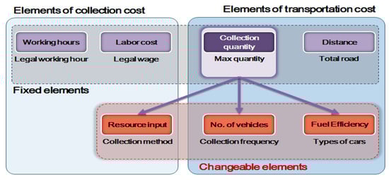 The high cost per ton of actual trial in this study was due to the lack of conditions currently present in the collection company that would specialize in diaper collection and the limited number of participating daycare centers and small quantity of diaper waste collected. So, it was hoped to improve the results of this study to optimize collection and transportation costs. Therefore, optimizing the collection/transportation costs by addressing the factors that incur them will contribute to making the recycling of diaper waste more economically feasible. The cost factors consist of collection and transportation factors. As you can see in Figure 3, a significant cost influencing factor was the quantity of collection and the number of vehicles, which is associated with frequency of collection. The most important variable was the quantity of collection and this would result in the number of vehicles and the number of working people deployed. Fuel efficiency and collection frequency were considered as the next major variables. The daily distance was defined as the total length of the area, so we could optimize the route through which the collection vehicles were travelling.